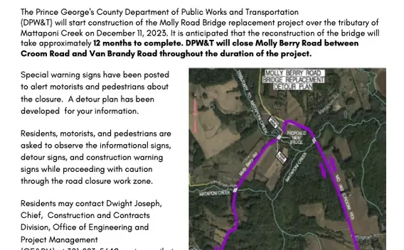 Molly Berry Road between Croom Rd and Van Brandy Road will be closed throughout the duration of the project.