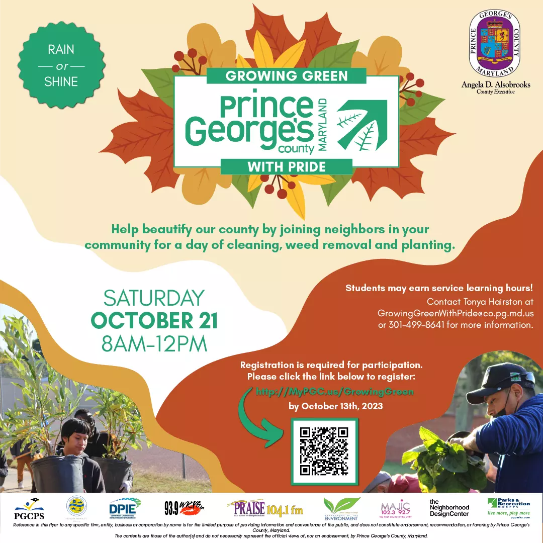 Thank you for your continued support as we work together to make the Fall 2023 “Growing Green with Pride Day” a huge success for Prince George’s County. Together, we will ensure that Prince George’s County remains the Crown Jewel of Maryland.