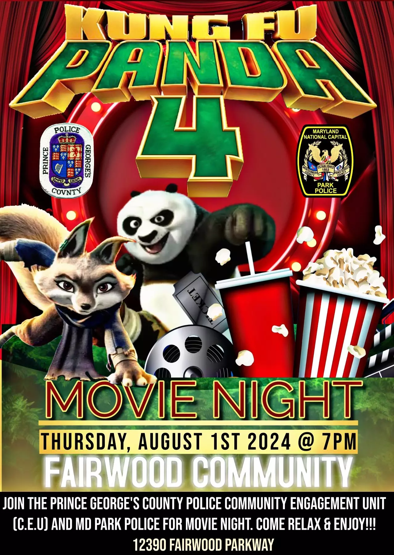 Fairwood residents, come out August 1, 2024, and meet neighbors, your Bowie - Division II Community Engagement Unit, and Park Police Representatives for a fun filled night.