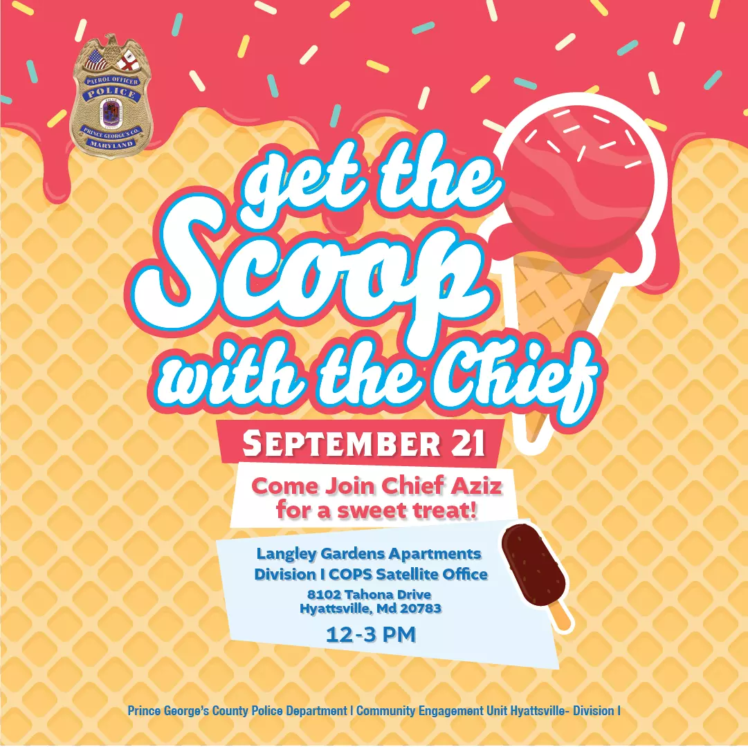 Prince George's County Departments & Offices Events Ice Cream With Chief Aziz Ice Cream with Chief Aziz Date(s): September 21, 2024 to September 21, 2024 Times(s): 12:00pm 3:00pm Join the Chief of Police for Ice Cream on Sept. 21st at 8102 Tahona Drive, Hyattsville, MD. The first 250 kids will get FREE Ice Cream. Add to Calendar Select a calendar Default Calendar Google Calendar Download ICS Office 365 Outlook Web Yahoo Calendar Add to Calendar Default Calendar Google Calendar Download ICS Office 365 Outlook Web Yahoo Calendar Share this content: Police - Bureaus & Police Stations - Police Stations Bureau of Administration - Police Personnel Division Psychological Services Division Records Management Division Recruiting and Background Division Risk Management Training and Education Division Bureau of Forensics Bureau of Homeland Security Bureau of Investigation - Criminal Investigation Division Narcotic Enforcement Division Special Crimes Division Strategic Investigations Division Bureau of Patrol Citizens' Police Academy Community Services - COPs in the Community Community First Division - Community Outreach Faith Based Initiatives Police Athletic League (PAL) Police Explorers Upcoming Events Join the Department - How to Join PGPD Entry Level Police Officer Experienced Officer / Comparative Compliance Experienced Officer / Maryland Certified Intern Opportunities - Academic Studies Intern Program Summer Youth Employment Program SYEP Police Cadet Program Crossing Guard Salary & Benefits Online Services - File a Police Report Online Submit Compliment / Complaint MPIA / FOIA Requests - Immigration Background Check Police Reports Automated Enforcement Program - Automated Enforcement Locations About PGPD - Resources - Crime Information - National Uniform Crime Reporting Program Open Data Portal Theft From Auto Prevention Important Phone Numbers Policy and Publications Prince George's County Crime Solvers History - Former Chiefs In Remembrance Mission and Value Statement