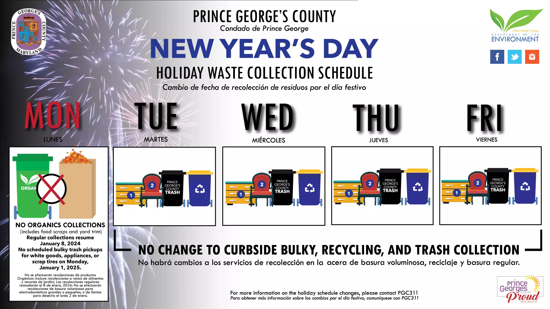 LARGO, MD – The Prince George’s County Department of the Environment (DoE) announces the following services and facilities will be closed or suspended on Monday, January 1, 2024: