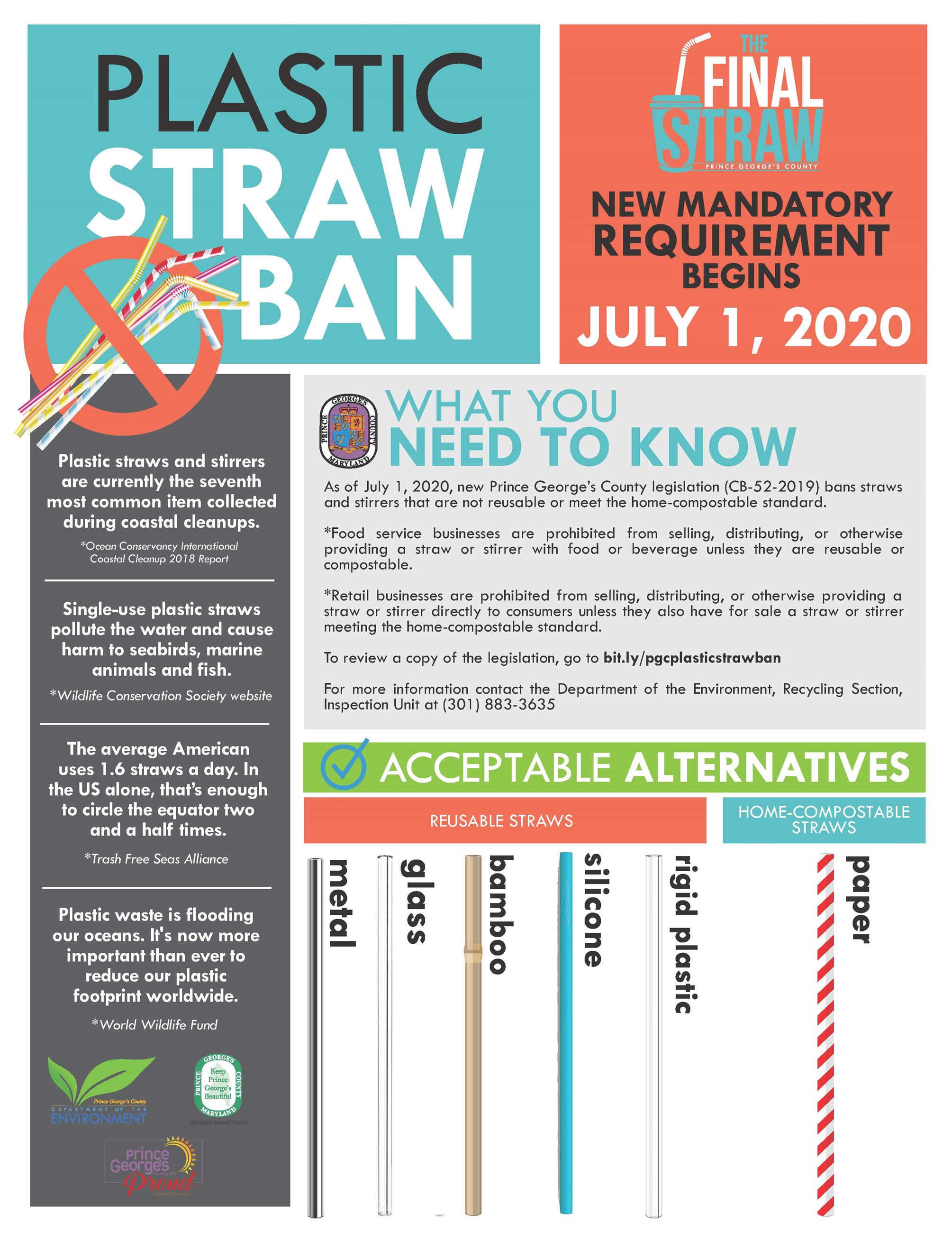 New Prince George’s County legislation (CB-52-2019) bans straws and stirrers that are not reusable or meet the home-compostable standard.