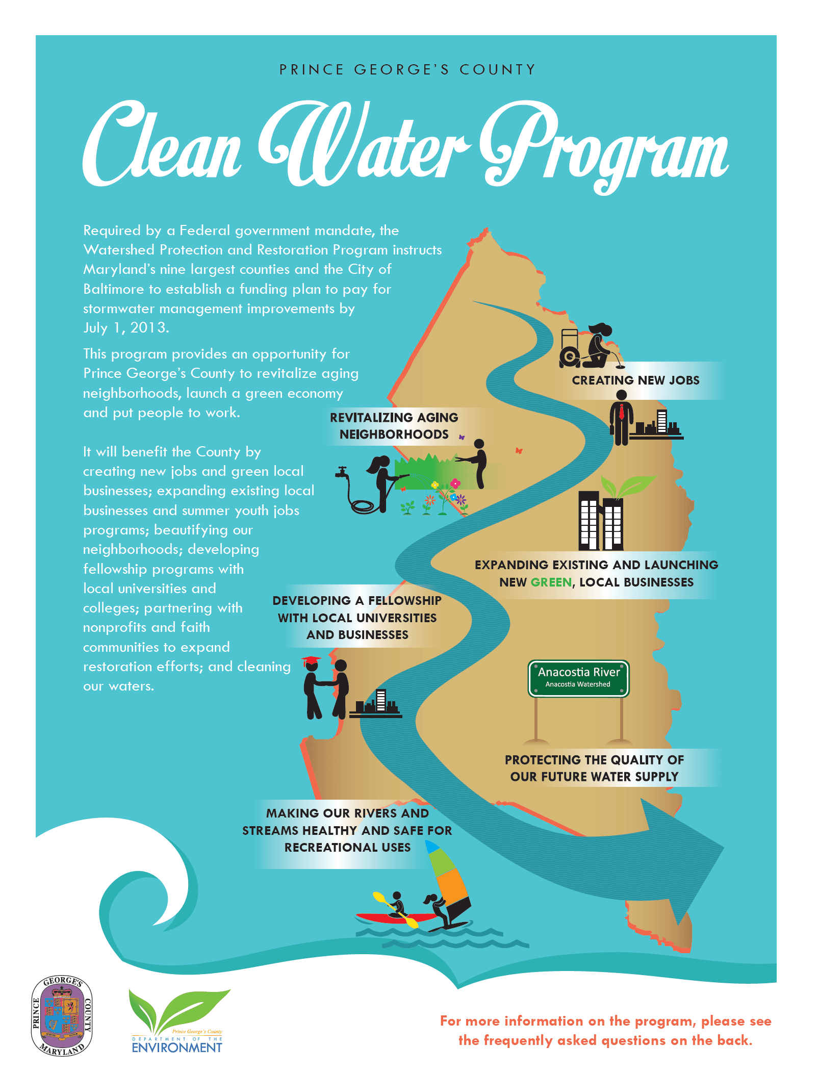 The mission of the Department of the Environment is to protect and enhance the natural and built environments of Prince George's County by enforcing Federal, State and County laws to create a healthy, safe and aesthetically pleasing environment for all residents and businesses of the County. The Stormwater Management Division is responsible for implementing the Clean Water Act Fee and Rain Check Rebates Program. Read how PGC satisfied regulatory stormwater management requirements using a community-based public-private partnership (P3).
