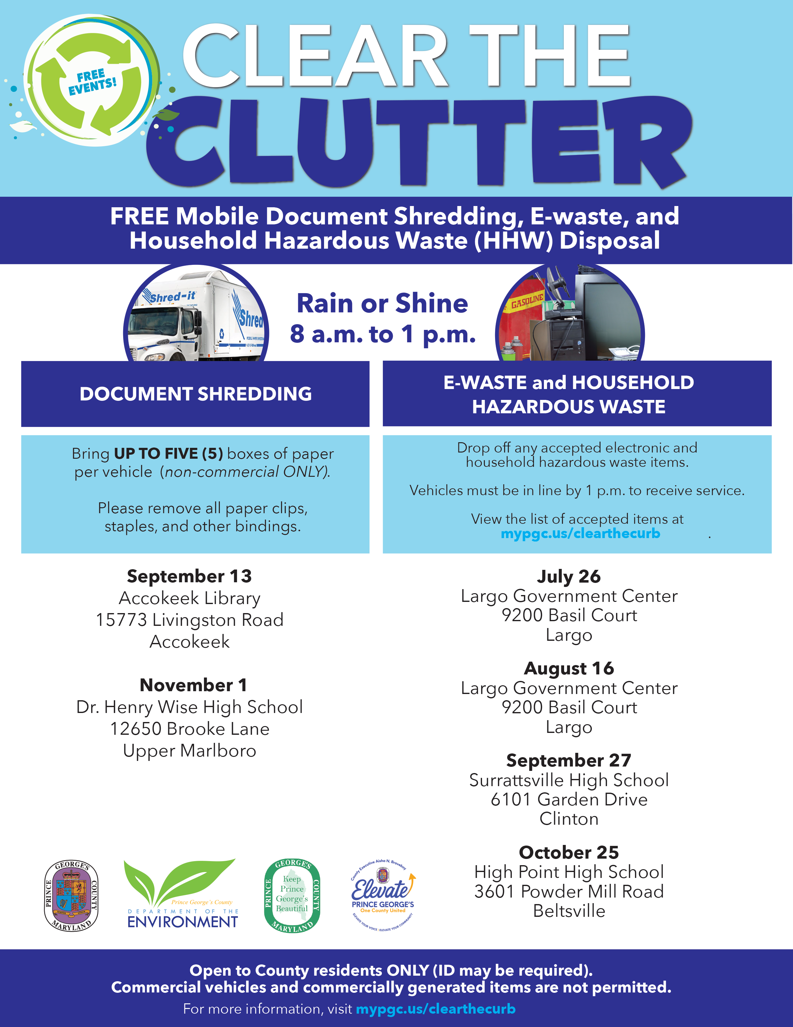 Effective April 15, 2024, due to ongoing construction, the Household Hazardous Waste (HHW), Electronic Waste (E-waste) and other associated lots at the Brown Station Road Sanitary Landfill, 11611 White House Road in Upper Marlboro, will temporarily close to the public until further notice. Residents can take Electronics to the Brown Station Road Convenience Center, 3501 Brown Station Road, Upper Marlboro, for proper disposal.