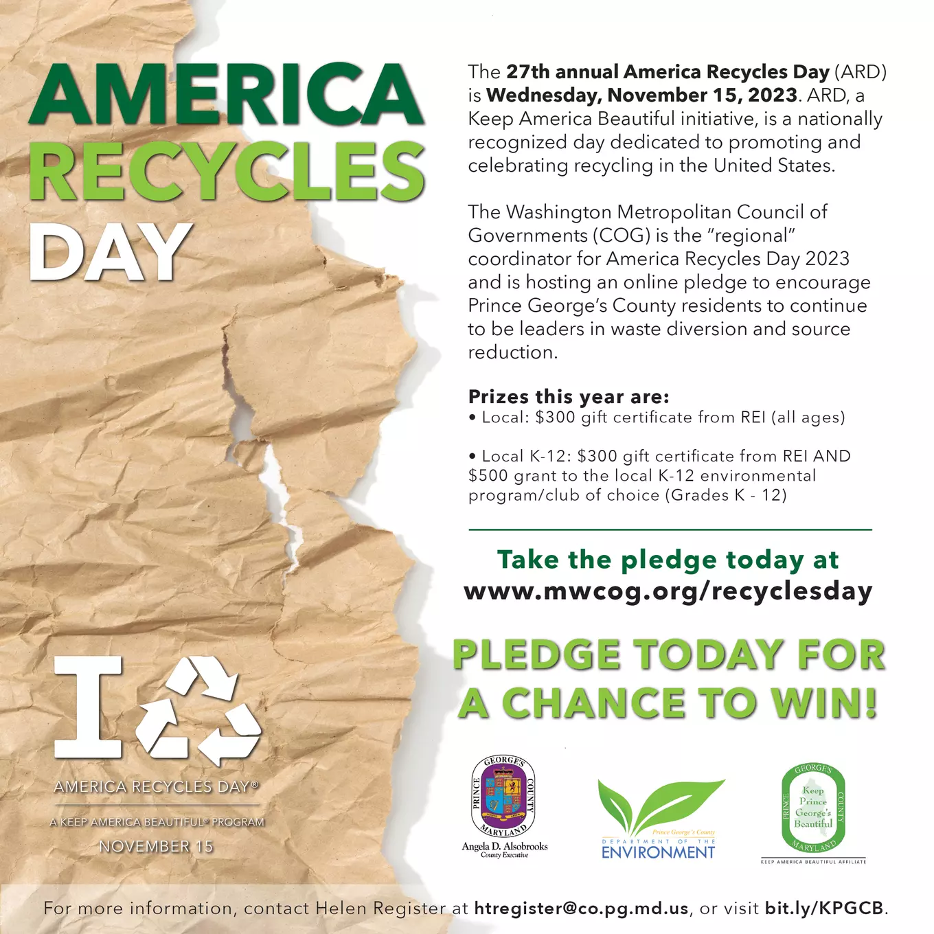 In honor of America Recycles Day/National Recycling Day on November 15 and the County’s continued efforts to promote recycling and waste diversion, Prince George’s County Department of the Environment (DoE), Sustainable Waste Management Division (SWMD) in partnership with Keep Prince George’s County Beautiful (KPGCB) will host the annual Waste Diversion and Recycling Awards 2025 ceremony that will take place in person in one of Prince George's County Public Schools (PGCPS), Green Schools, in January 2026. This event recognizes Prince George’s County commercial businesses, non-profit organizations, schools, individuals, and other entities that have demonstrated exceptional achievements in recycling and waste diversion to advance the betterment of the environment.
