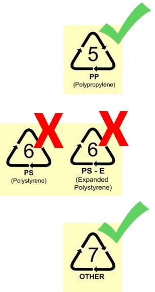 - "6" signifies polystyrene (PS) such as plastic utensils, Styrofoam™, cafeteria trays, etc.