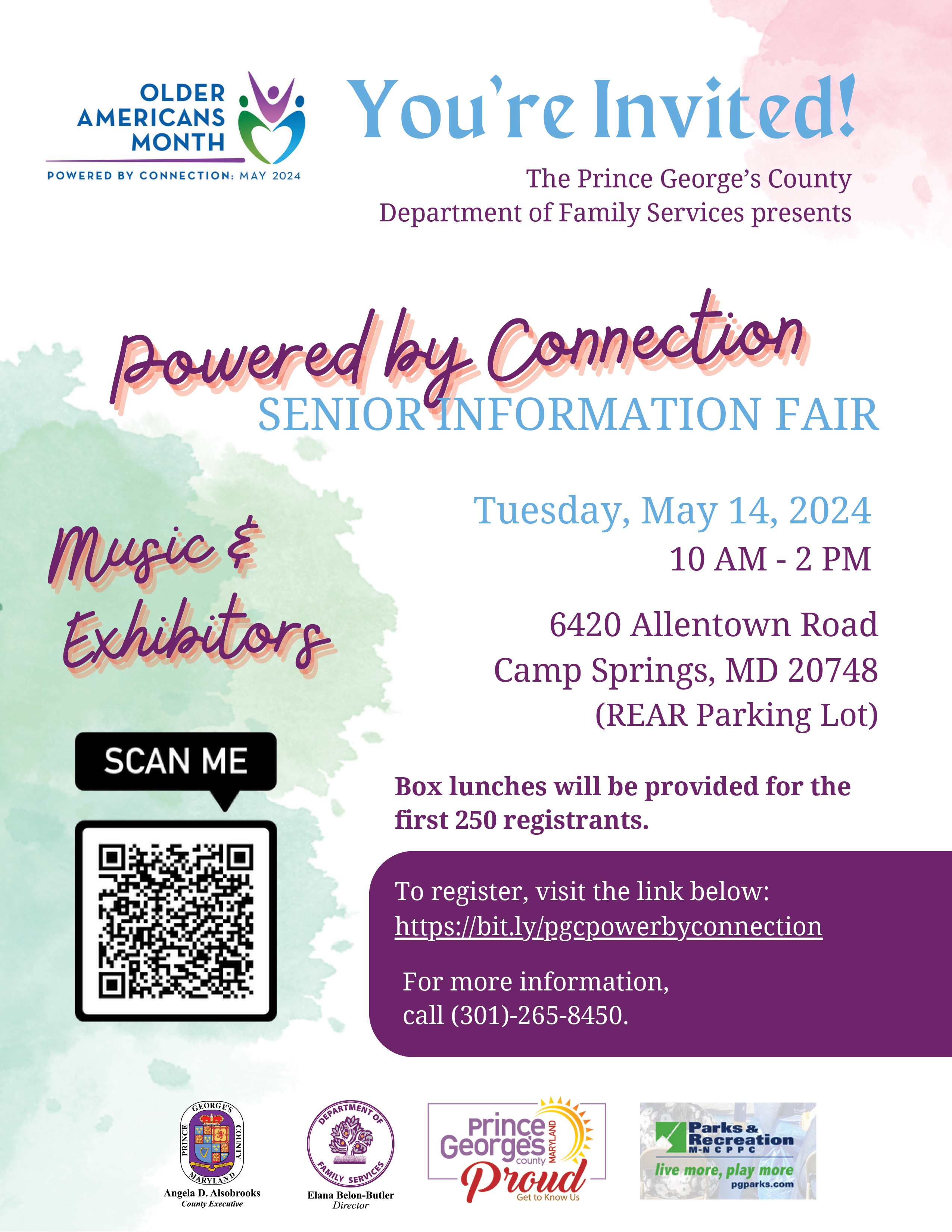 In recognition of Older Americans Month (May), the Department of Family Services Aging and Disabilities Services Division (DFS) would like to recognize the impact of meaningful relationships and social connections on health and well-being. Join us, on Tuesday, May 14, 2024, for the Annual Senior Information Fair, from 10:00 AM to 2:00 PM. Explore the role that connectedness plays in supporting independence and aging in place. Information will be provided regarding programs and services for older adults. A box lunch will be provided for the first 250 registered attendees. Participants can also enjoy music and visit local vendors. This is an outdoor event. For more information and to register, click here.
