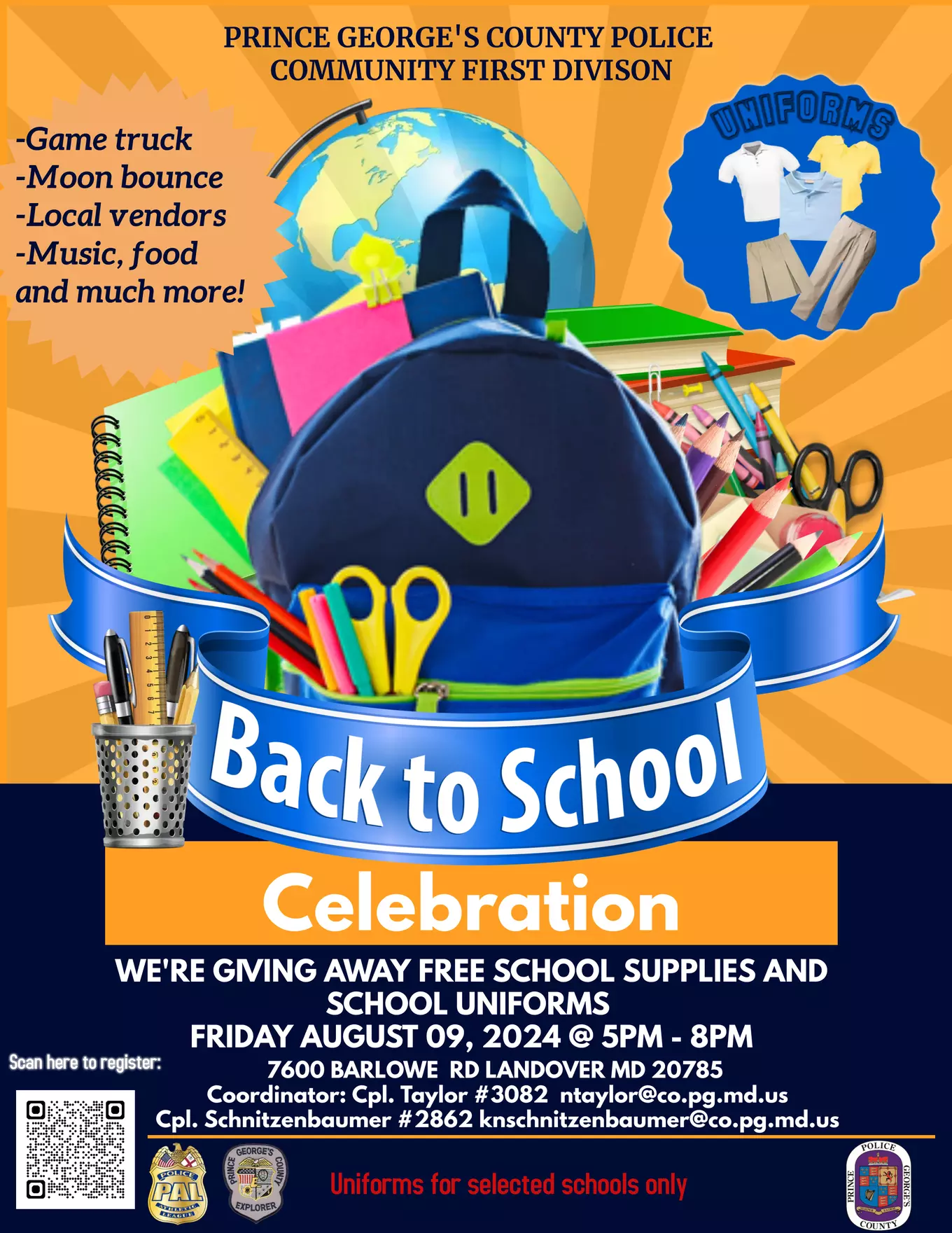 The Prince George's County Police Department Community First Division is hosting a FREE uniform and backpack giveaway! The uniform giveaway is only for a select number of schools in Oxon Hill, Maryland. The participating schools are listed below.