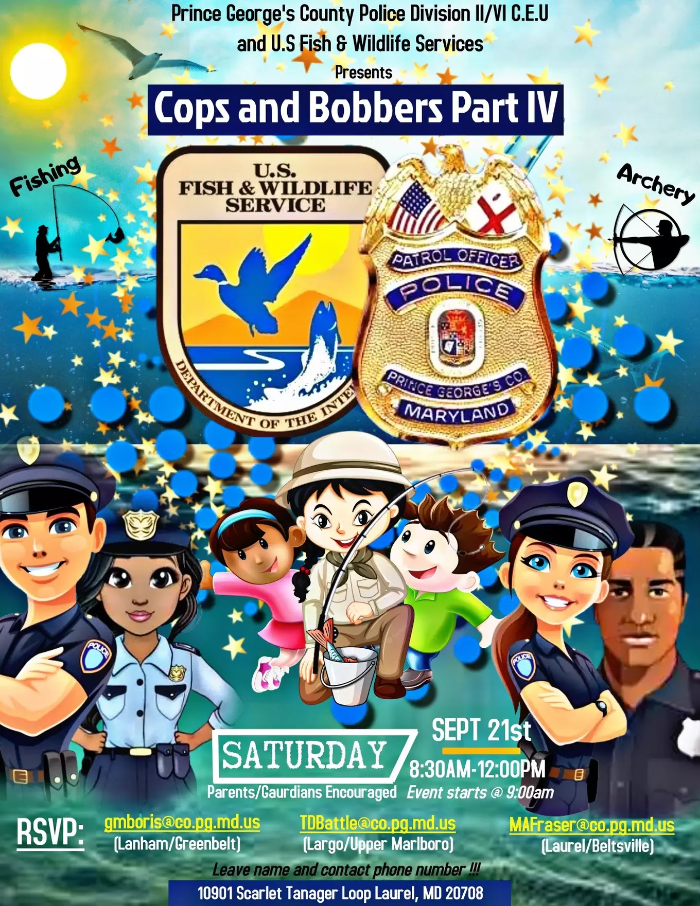 Prince George's County Departments & Offices Events Cops and Bobbers Part IV Cops and Bobbers Part IV Date(s): September 21, 2024 to September 21, 2024 Times(s): 8:30am 12:00pm Come join us for a fun day of fishing and archery! Date: September 21, 2024 Time: 8:30 a.m. to 12:00 p.m. Location: Patuxent Research Refuge 10901 Scarlet Tanager Loop Laurel, MD 20709 Add to Calendar Select a calendar Default Calendar Google Calendar Download ICS Office 365 Outlook Web Yahoo Calendar Add to Calendar Default Calendar Google Calendar Download ICS Office 365 Outlook Web Yahoo Calendar Share this content: Police - Bureaus & Police Stations - Police Stations Bureau of Administration - Police Personnel Division Psychological Services Division Records Management Division Recruiting and Background Division Risk Management Training and Education Division Bureau of Forensics Bureau of Homeland Security Bureau of Investigation - Criminal Investigation Division Narcotic Enforcement Division Special Crimes Division Strategic Investigations Division Bureau of Patrol Citizens' Police Academy Community Services - COPs in the Community Community First Division - Community Outreach Faith Based Initiatives Police Athletic League (PAL) Police Explorers Upcoming Events Join the Department - How to Join PGPD Entry Level Police Officer Experienced Officer / Comparative Compliance Experienced Officer / Maryland Certified Intern Opportunities - Academic Studies Intern Program Summer Youth Employment Program SYEP Police Cadet Program Crossing Guard Salary & Benefits Online Services - File a Police Report Online Submit Compliment / Complaint MPIA / FOIA Requests - Immigration Background Check Police Reports Automated Enforcement Program - Automated Enforcement Locations About PGPD - Resources - Crime Information - National Uniform Crime Reporting Program Open Data Portal Theft From Auto Prevention Important Phone Numbers Policy and Publications Prince George's County Crime Solvers History - Former Chiefs In Remembrance Mission and Value Statement