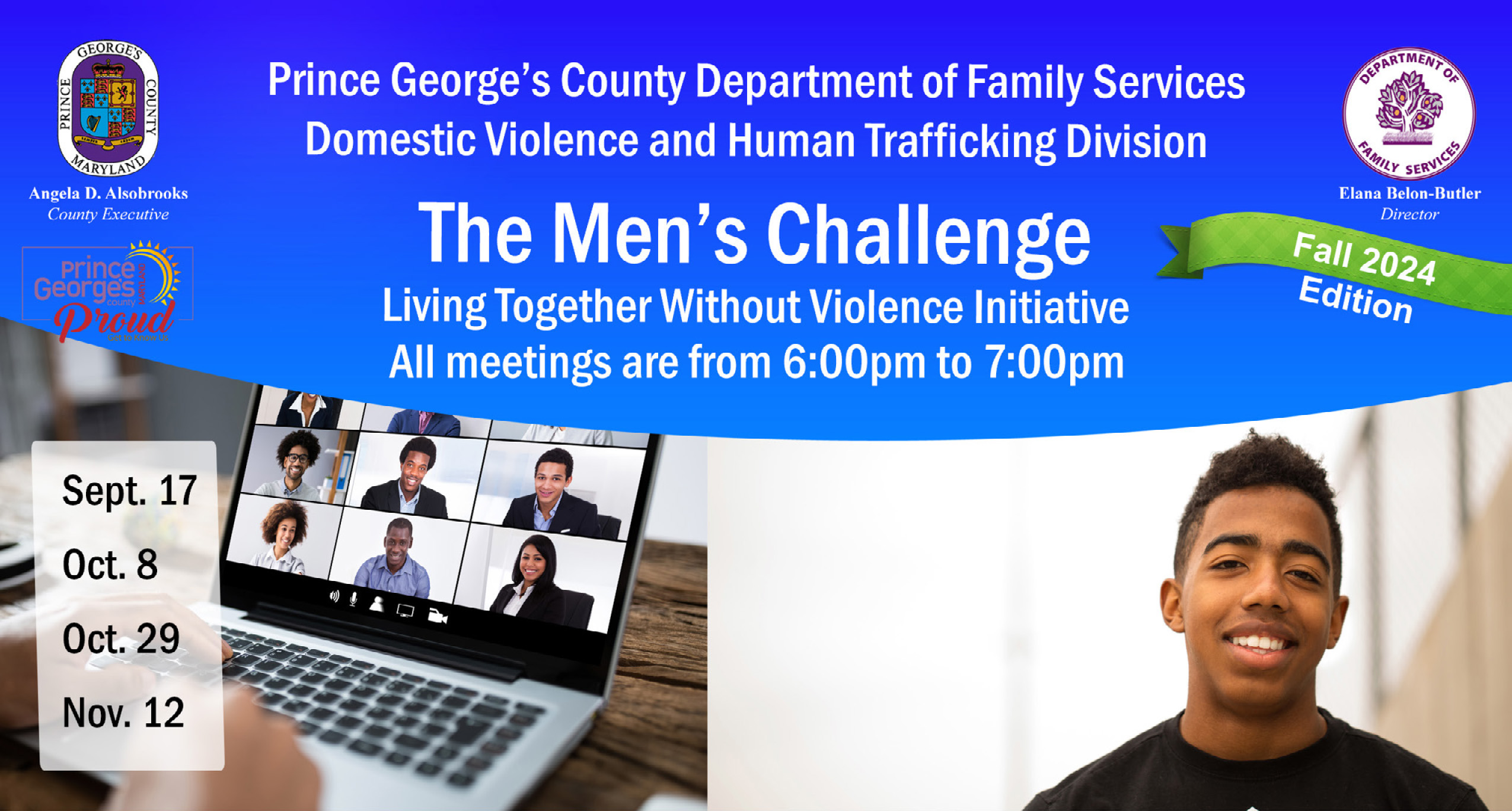 The Department of Family Services is excited to host its Fall Edition of the Men’s Challenge Initiative — Living Together Without Violence - a series of virtual group discussions that seek to influence men and boys through conversations about developing healthy relationships. Each session features dynamic presenters who focus on a wide range of topics.