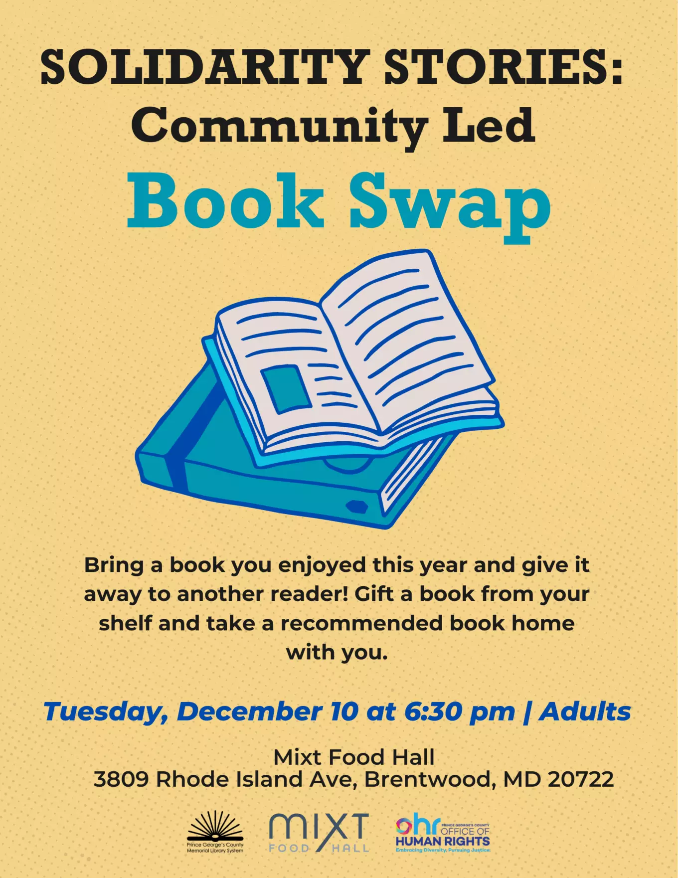 The Prince George's County Office of Human Rights and the Mount Rainier Branch Library are hosting a community book swap ahead of our 2025 book club meetings. Bring one or two books that you think others will enjoy, and make space for a new, interesting book to add to your collection!