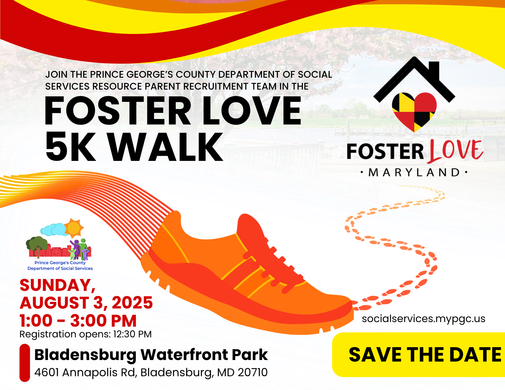 Register for this event at: https://PGCDSSFosterLove5kWalk2025.eventbrite.com. For questions, please contact Resource Parent Recruiter Lisa Robertson at: lisa.robertson@maryland.gov.