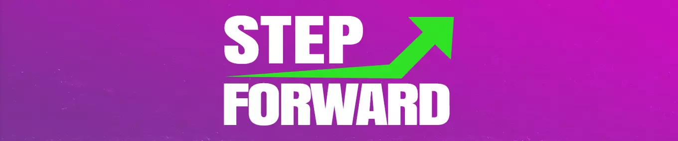 The step forward logo with a purple background and the green arrow pointing upwards.