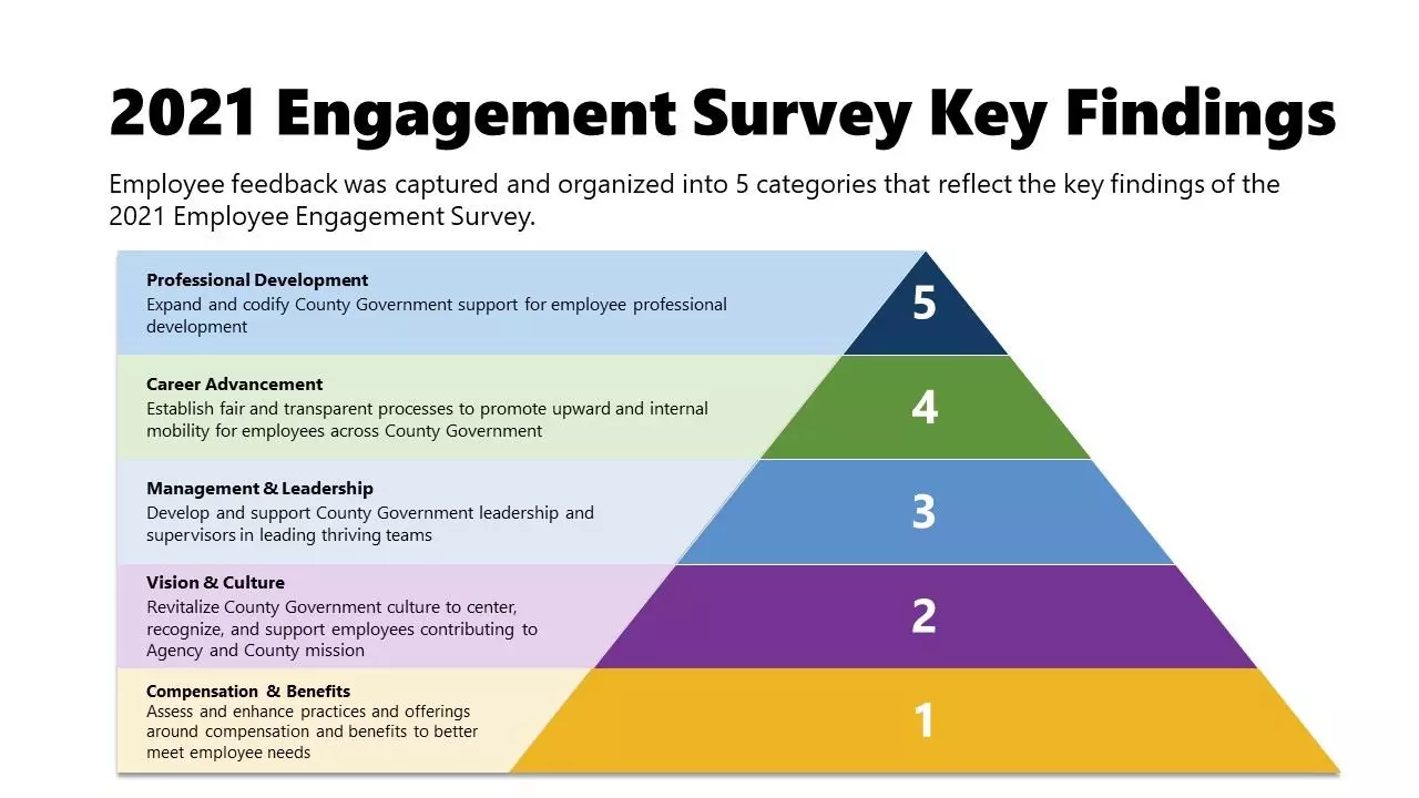 The Employee Engagement Survey is an anonymous feedback tool designed to better understand the work experience of County Government employees. The results gathered will provide a valuable tool for OHRM to ensure the County Government workforce is engaged, supported, and motivated. The survey specifically focuses on gaining insight into several key areas of the County Government employee experience, including: