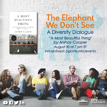 August 30, 2022 - Our Elephant We Don't See Diversity Dialogue with PGCMLS continues as we discuss Arshay Cooper's A Most Beautiful Thing. Long-time co-host Michelle Hamiel has taken a new position and so this evening's conversation will include two special guest co-hosts representing both the library and the Office of Human Rights. Watch it here: https://www.youtube.com/watch?v=Vd31Omwqi5M