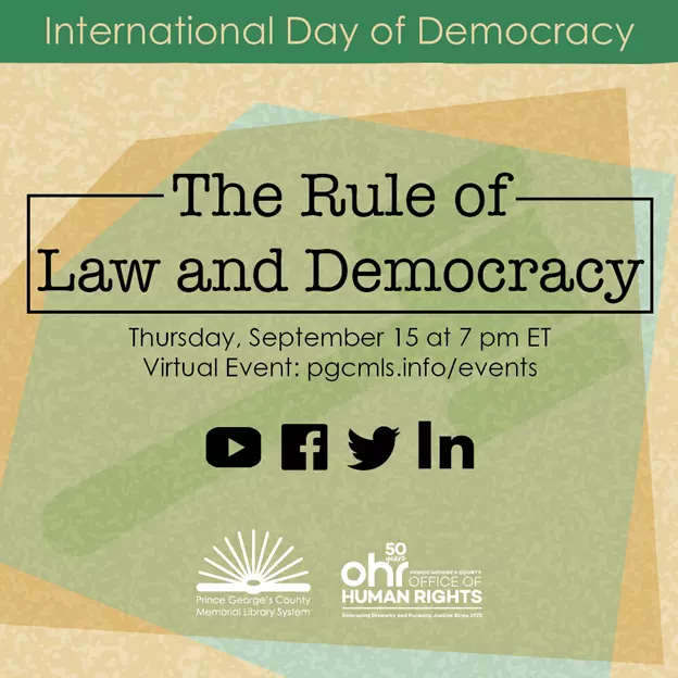 September 15, 2022 - Judge Sean Wallace and attorney Gabriel Chrisian will joined the Office of Human Rights Executive Director Battle-Brooks n partnership with PGCMLS to discuss the connection between The Rule of Law and Democracy. Join us as these three dynamic speakers and legal minds wrestle with the future of American democracy and the impact on the rule of law. Watch this event here: https://www.youtube.com/watch?v=lsV0AnGzrhw.