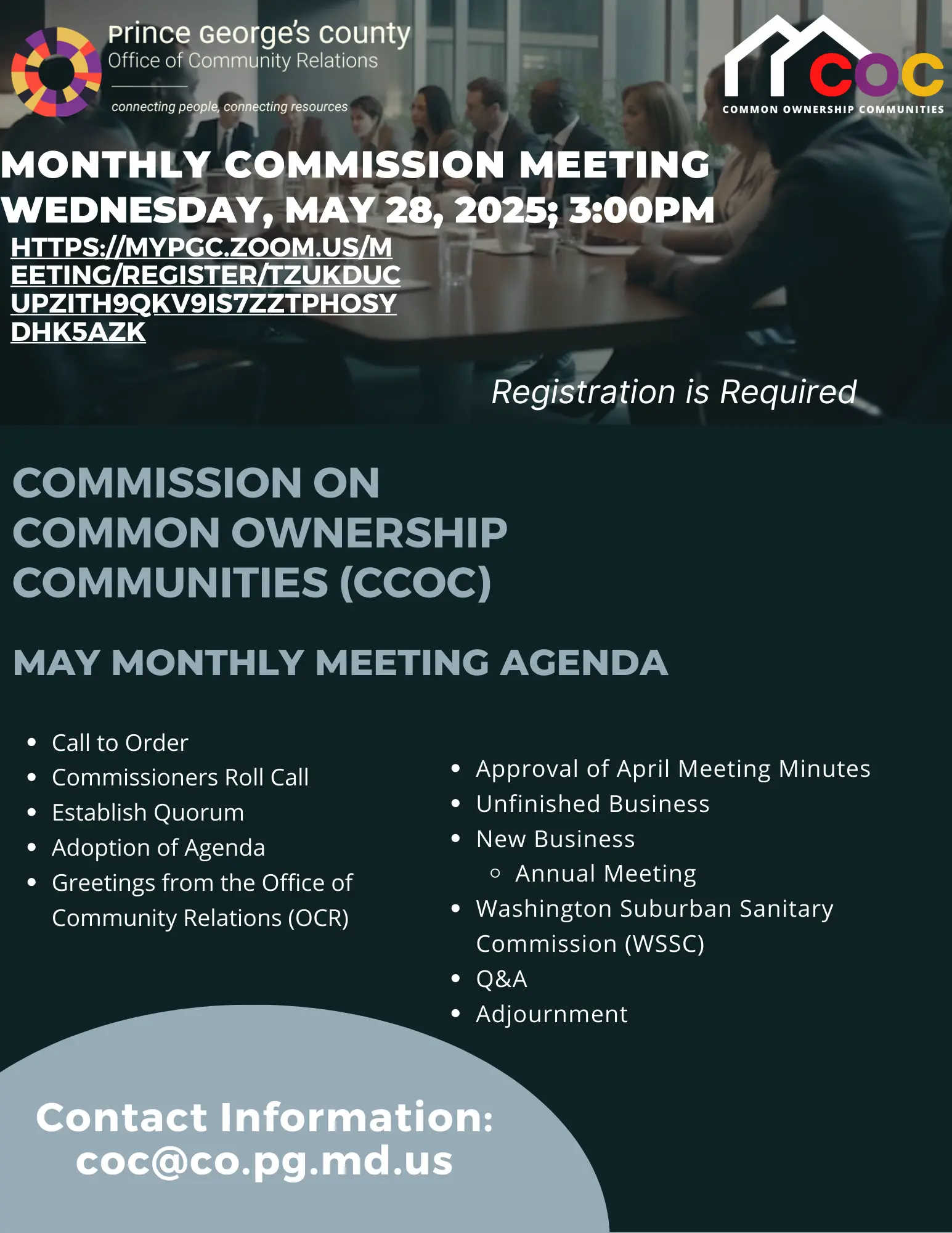 The Prince George’s County Office of Community Relations will partner with the Commission on Common Ownership Communities to host a virtual meeting.