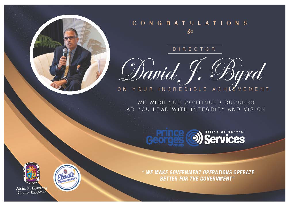 Prince George's County News & Events News David J. Byrd Is Confirmed As The Director For The Office of Central Services Sidebar Navigation Government + County Government + Boards & Commissions County Council Courts About PGC + Agendas & Minutes County Code of Ordinances DataPGC History How Government Works Maps Departments & Offices + Community Relations Economic Development Corporation Experience Prince George's Maryland-National Capital Park & Planning Residents + Residents News & Events + County Highlights News Department & Office News Events Meetings How Do I... + Contact + 9-1-1 Emergency Communications Behavioral & Mental Health Providers PGC311 Staff Directory Find + Property Tax Information Public Safety Recordings Transportation Services Report + Downed Trees Property Maintenance Complaint Roadway Hazards Sign-Up + Community Service Opportunities Drain Stenciling Program Geographic Development Incentives Neighborhood Cleanup Program Pay + Animal Shelter Donations County Invoices Family Services Property Taxes Summer Youth Program Donations Housing Rehabilitation Assistance Programs David J. Byrd is confirmed as the Director for the Office of Central Services April 1, 2026 Share this content: Central Services - About OCS - Director's Office Fleet Management Facilities Operation & Management General Services Division - Graphics and Reproduction Center Mail and Courier Services Materiel Management Records Management Land Acquisition and Real Property Division - County Codes Frequently Asked Questions QUESTIONS & ANSWERS Leasing / Lease Administration Programmatic Planning Process Stages of a New Project LARP Solicitation Opportunities