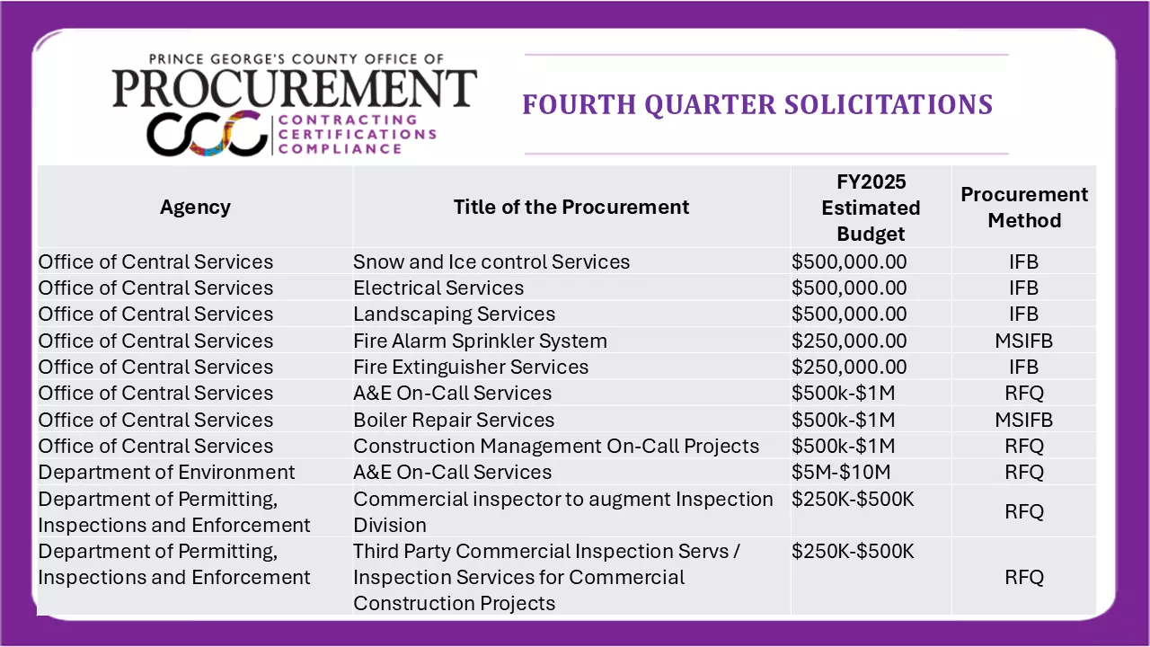 The fourth quarter of the fiscal year is typically a busy time – closing out the current year, opening the new fiscal year 2026 and planning for the upcoming 2027 year. The Office of Procurement is committed to partnering with government agencies and local businesses to develop a thriving small business ecosystem in Prince Georges County. Together we win.