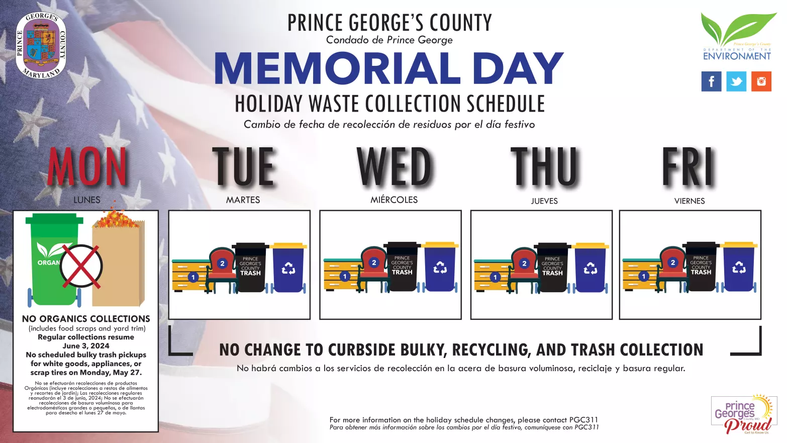 Also, PGC311 will be closed on Monday, May 27, 2024, and will resume regular operations on Tuesday, May 28, 2024, 7 a.m. – 7 p.m. However, residents can still submit service/issue requests online at PGC311.com.