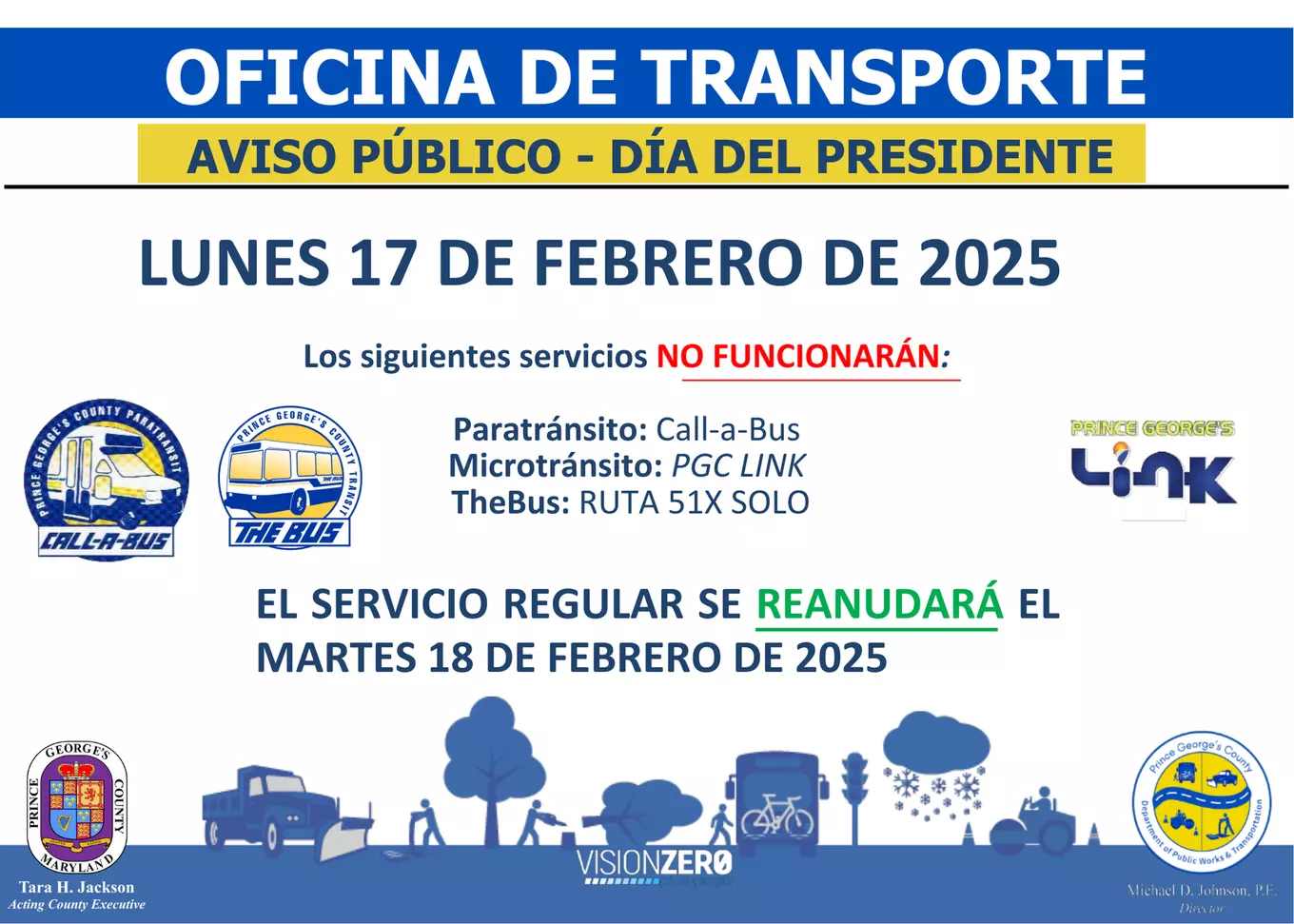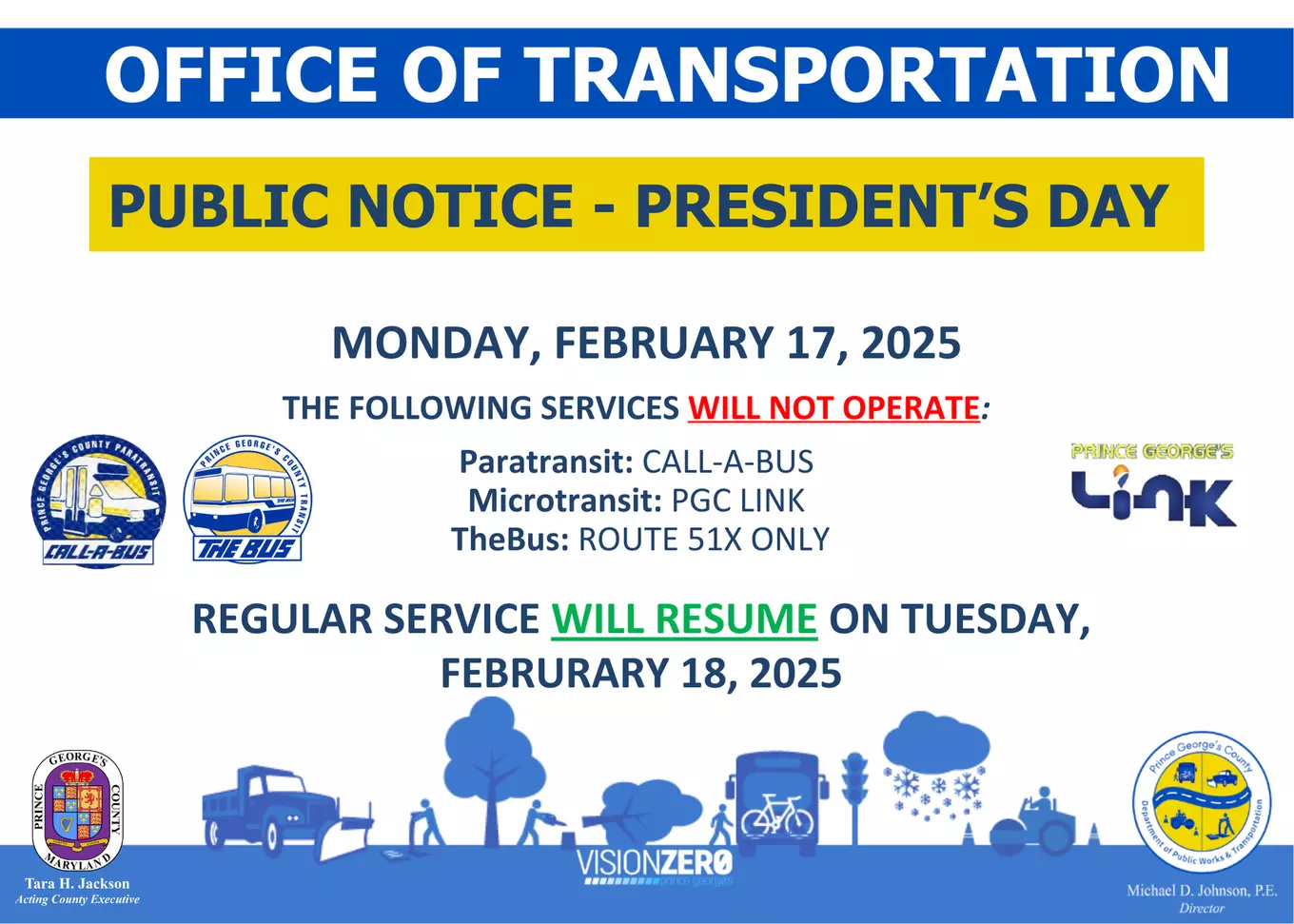 TheBus, a public transit service operated by the Prince George’s County Department of Public Works and Transportation, will have limited operations on Monday, September 1, 2025. Regular operations will resume on Tuesday, September 2, 2025. In addition, the County’s Call-A-Bus and Microtransit PGC Link services will not operate on Monday, September 1, 2025. Regular operations of the Call-A-Bus and Microtransit PGC Link services will resume on Tuesday, September 2, 2025.