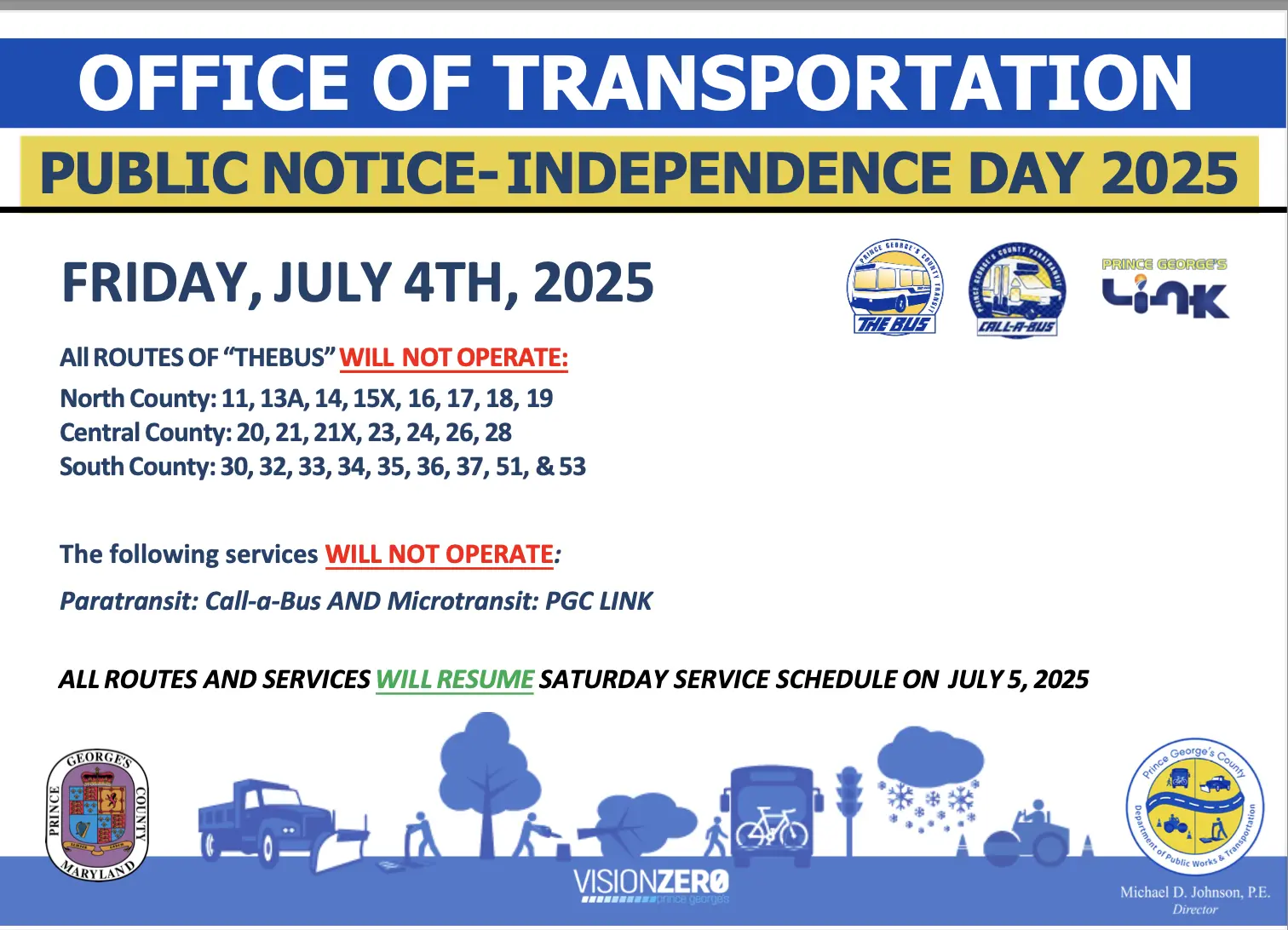 TheBus, a public transit service operated by the Prince George’s County Department of Public Works and Transportation (DPW&T), will not operate on Friday, July 4, 2025. Regular operations of TheBus will resume on Saturday, July 5, 2025. The County’s Call-A-Bus and PGC Link services, including dialysis transportation, will not operate on Friday, July 4, 2025. Regular operations of the Call-A-Bus and PGC Link services will resume on Saturday, July 5, 2025.