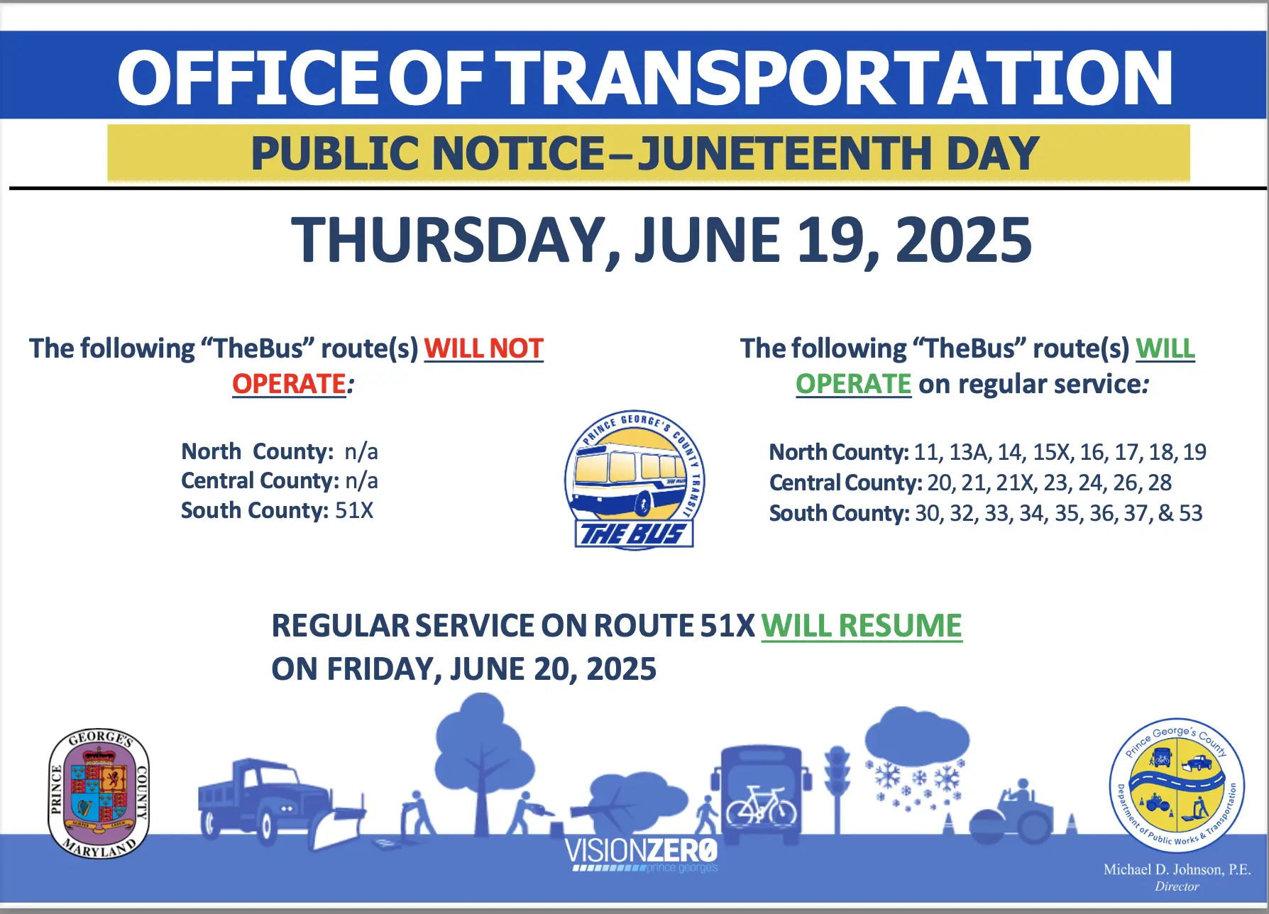 TheBus, a public transit service operated by the Prince George’s County Department of Public Works and Transportation (DPW&T), will operate as scheduled on Thursday, June 19, except for Route 51X. Regular operations of Route51X will resume on Friday, June 20, 2025. Regular operations of the County’s Call-A-Bus, and PGC Link services, including dialysis transportation, will not operate on Thursday, June 19, 2025. Regular operations of the Call-A-Bus, and PGC Link services will resume on Friday, June 20, 2025.