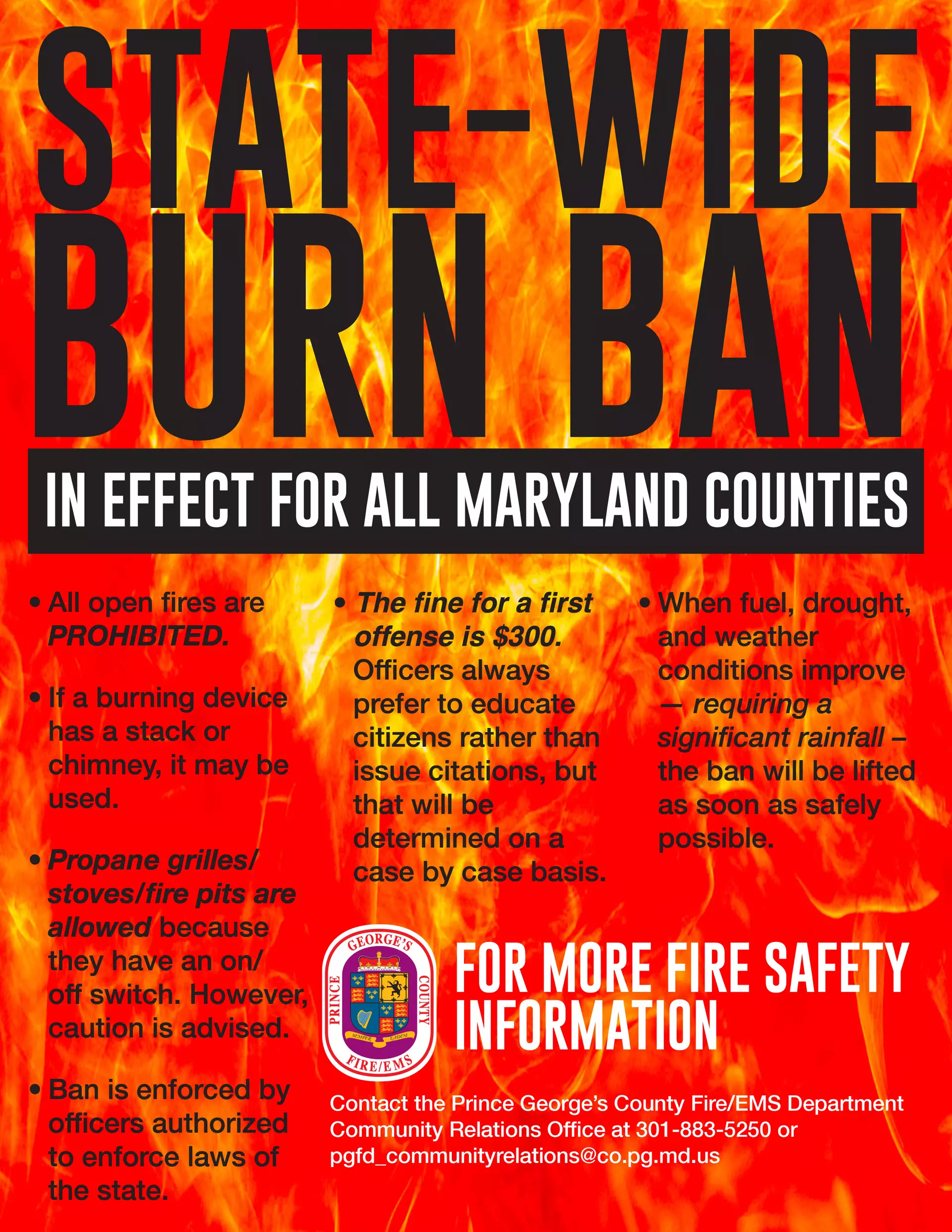 Prince George's County News & Events News State-Wide Burn Ban Sidebar Navigation Government + County Government + Boards & Commissions County Council Courts About PGC + Agendas & Minutes County Code of Ordinances DataPGC History How Government Works Maps Departments & Offices + Community Relations Economic Development Corporation Experience Prince George's Maryland-National Capital Park & Planning Residents + Residents News & Events + County Highlights News Department & Office News Events Meetings How Do I... + Contact + 9-1-1 Emergency Communications Behavioral & Mental Health Providers PGC311 Staff Directory Find + Property Tax Information Public Safety Recordings Transportation Services Report + Downed Trees Property Maintenance Complaint Roadway Hazards Sign-Up + Community Service Opportunities Drain Stenciling Program Geographic Development Incentives Neighborhood Cleanup Program Pay + Animal Management Citations Animal Shelter Donations County Invoices Family Services Property Taxes Summer Youth Program Donations Housing Rehabilitation Assistance Programs State-Wide Burn Ban November 7, 2024 State-wide burn ban in effect for all Maryland Counties. Share this content: Fire & Emergency Medical Services - Office of the Fire Chief - Agency Organizational Chart Emergency Services Command - Mobile Integrated Health Support Services Command Administrative Services Command - Technology & Information Services Office Volunteer Services Office - Beltsville Fire Station Fire Commission Resources - General Orders Health & Wellness Resource Center Join the Department Member Services Important Numbers