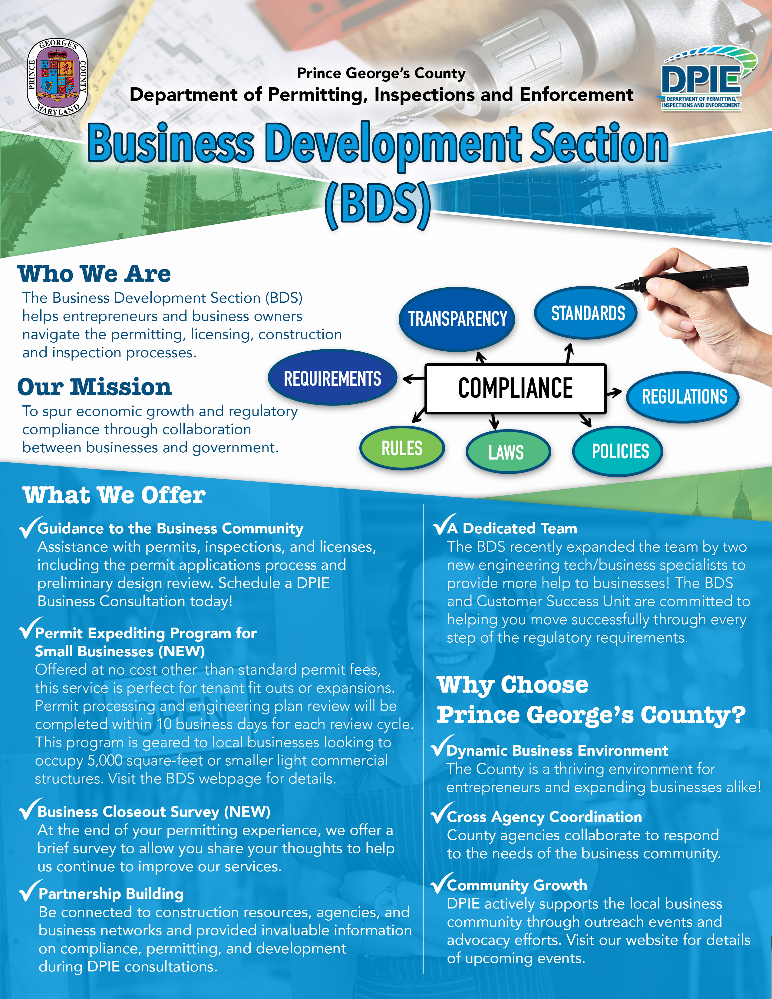 The BDS has demystified DPIE’s requirements and given business owners a team to support them through the process. Whether you need assistance opening a hair salon or pulling permits to expand a restaurant, the BDS stands ready to assist you. If you would like to schedule a meeting with us, complete the Municipality Meeting Request form to discuss the permit, license, and inspection requirements of your business in Prince George's County.