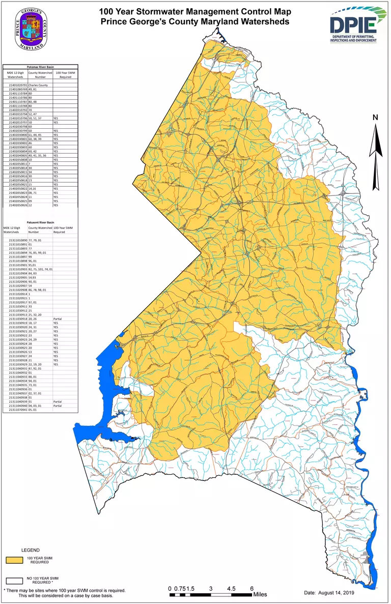 View the new "100 Year Stormwater Management Control Map, Prince George's County, Maryland, Watersheds." The map includes the MDE 12-Digit Watershed numbers, the County Watershed numbers, and whether or not a 100-Year Stormwater Management is required. The listings are for both the Potomac and the Patuxent River Basins.