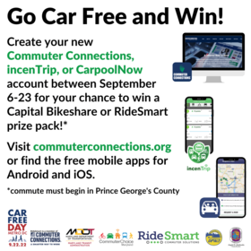 September 22 is Car Free Day! Visit www.carfreemetrodc.org to take the free Car Free Day pledge and earn rewards, get some great local resources, and more! If your commute starts in Prince George's County, we have more ways for you to win! New Commuter Connections, incenTrip, or CarpoolNow accounts created online or through the free apps between September 6 and September 23 may be eligible to win a prize pack! Visit www.commuterconnections.org or www.commuterconnections.org/mobile-apps/ to get started.