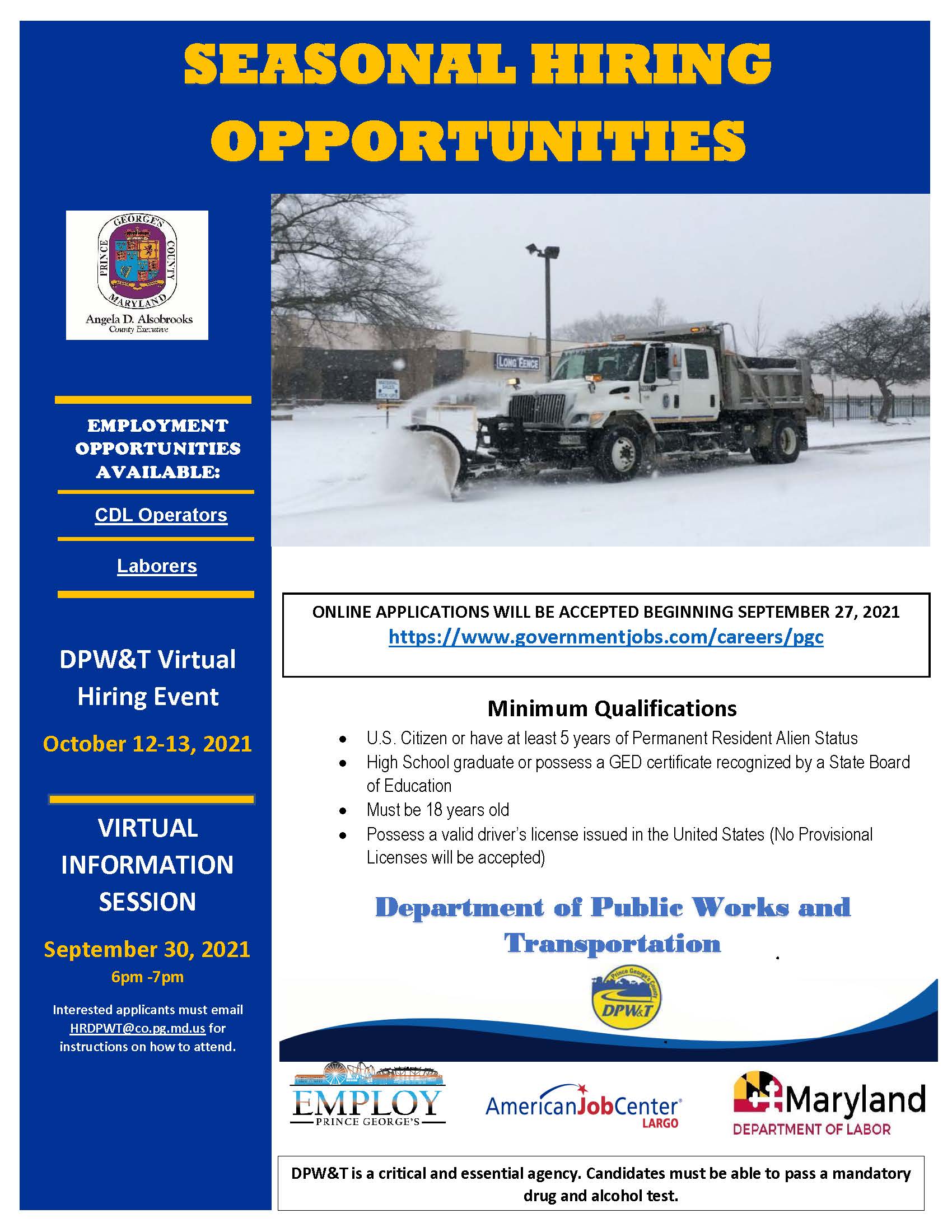 For employment opportunities with DPW&T, please visit Prince George’s County Government Employment. Online Applications for Seasonal Hiring Opportunities will be available in Fall 2024. Save this page and visit often for updates on our information sessions and virtual hiring events.