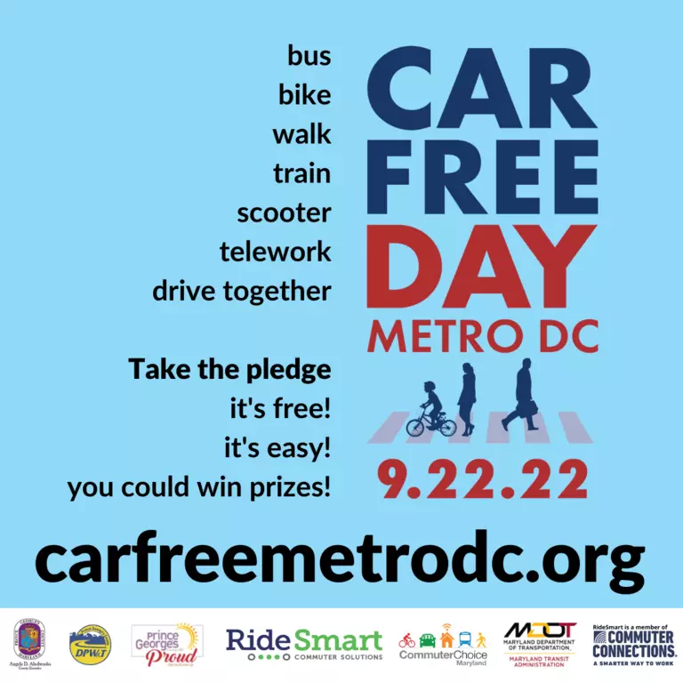 September 22 is Car Free Day! Visit www.carfreemetrodc.org to take the free Car Free Day pledge and earn rewards, get some great local resources, and more! If your commute starts in Prince George's County, we have more ways for you to win! New Commuter Connections, incenTrip, or CarpoolNow accounts created online or through the free apps between September 6 and September 23 may be eligible to win a prize pack! Visit www.commuterconnections.org or www.commuterconnections.org/mobile-apps/ to get started.